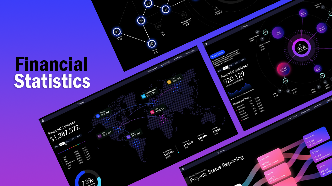 An advanced financial dashboard that provides in-depth analysis of the company's performance, including income sources, geographical insights, sales processes, and project status. With multiple pages of detailed visualizations, it enables strategic decision-making, while the user-friendly interface and interactive visuals enhance financial management, planning, and overall business insights.